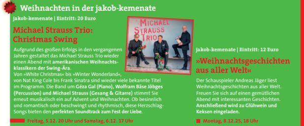 Christmas Swing 5.12., 20 Uhr ausverkauft Weihnachtsgeschichten 8.12. ausverkauft Christmas Swing 6.12., 17 Uhr ausverkauft Warteliste!